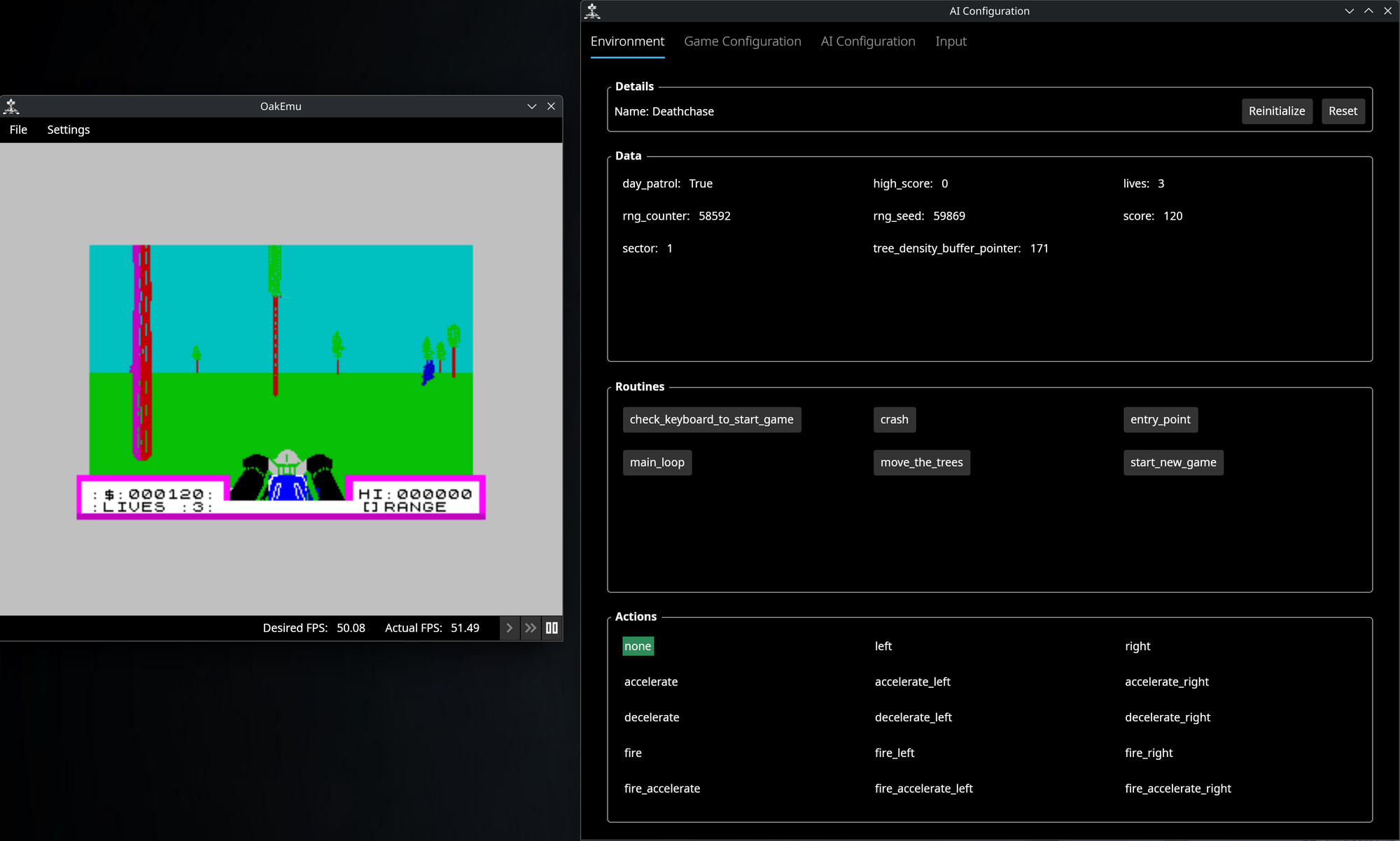Computers are deterministic, so if we start the game the same way every time we can expect it to proceed the same way too. This is not ideal for AI training as we want it to explore different outcomes. For games like Deathchase that use randomness, the randomize section allows us to update the data that controls that before starting an episode: