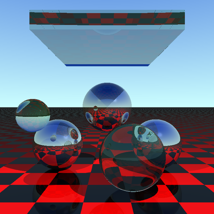 - The dark blue bar at the bottom of the box. Stepping through in the debugger this might actually be correct... For a light blue points on the left directly above the blue the ray from the camera is heading slightly left and upwards and strikes the bottom of the box. It refracts into the top of the box and heads out to the background towards the horizon. For the dark blue just below then the ray enters in a similar position but this time has moved just enough to refract into the back of the box instead it then leaves at a much steeper upward angle which sends it to a much darker blue part of the sky.