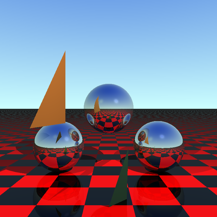 The one other thing we need to calculate is the surface normal. This is easy to do - we have the three points defining our triangle's vertices. From there we can calculate two vectors describing two of the sides. (This is needed for the intersection algorithm anyways) The cross product of two vectors gives a vector perpendicular to both - this will give us the normal we need. With this we can then add some triangles to our scene: